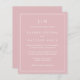 Einfache preiswerte Hochzeitseinladung mit modernem und elegantem Design mit zwei Buchstaben Monogramm oben und Ihren Details umgeben von einer dünnen Grenze. Der gesamte Text ist in Weiß auf einem rosa Rose-Hintergrund verstaubt. Die Schriftart und Hintergrundfarben können durch Anklicken des Buttons "Anpassen" in beliebig viele Farben geändert werden. Diese billigen Einladungen sind ideal für ein minimalistisches Paar.