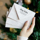 Eine einfache, stilvolle Rücksendeadresse Briefmarke für Ihre Urlaubskarten. Die Worte "Frohe Weihnachten" erscheinen in elegantem Kalligrafieschrift. Geben Sie Ihren Namen und Ihre Adresse in schwarzer Sans Serif.