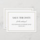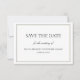 Einfache klassische typografische Save the Date Hochzeitskarte. Horizontales Layout mit Blockschrift und elegantem Skripttext innerhalb eines dünnen, doppelstrippten Randes. Kleines Monogramm auf der Rückseite. Klicken Sie zum Anpassen des Layouts auf Anpassen, Text bearbeiten und anschließend auf Textsegmente und ziehen Sie diese an die gewünschten Orte. Verwenden Sie Strg, um mehrere Bereiche gleichzeitig auszuwählen und zu verschieben. Das Monogramm auf der Rückseite kann entfernt werden, indem das Textfeld gelöscht oder der Eintrag in der Layoutansicht wie oben beschrieben gelöscht wird.