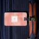 Ein einfaches, subtiler Marmor-Design Gepäckstück in Korallenrosa mit einem modernen, weißen quadratischen Abzeichen, das Sie personalisieren können, indem Sie Ihre mit Monogramm erste... Dies ist Teil der blühenden Dahlia Subtle Marble Monogram Collection.