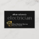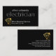 Auf einem schwarzen Cover befindet sich ein durchsichtiges Schild "Elektriker" in der Nähe der Kartenmitte. Ganz oben steht Ihr Prestigename mit einem goldenen Glühbirnen-Zuhause-Circuit-Logo, das Sie neben dem Firmennamen und den Kontaktinformationen am Fuß verwenden können. Auf der Rückseite sind die Kartendetails auf der rechten Seite mit dem goldenen Logo oben. Danach folgen Ihr Name, die Kontaktdaten und ein Slogan, um Ihre Dienste bekannt zu machen. Das ist eine kreative Karte für Elektriker.