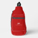 Ein individueller Rucksack im Sling-Stil mit einfachem minimalistischem Styling. Dieses Design in lebhaftem Rot mit weißer Schrift hat eine Textvorlage, die Sie mit Ihren Monogramm-Initialen und Namen personalisieren können. Für unterwegs ist es eine großartige Wahl für einen aktiven Lebensstil. Nutzen Sie es für Arbeit, Schule, Sport, Reisen und vieles mehr, um Ihr Wesentliches stilvoll mit sich zu tragen.