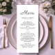 Genießen Sie Ihr Hochzeitsessen mit unseren Minimalistischen, schlichten Skriptmenükarten! Mit eleganter Skriptkalligraphie für Rubriken und knusprigem schwarzem Text auf unberührtem weißem Hintergrund vereinen diese Karten Lesbarkeit mit schwacher Eleganz. Dieses minimalistische Design ist vollständig mit Ihren Menüpunkten und Namen anpassbar und ergänzt nahtlos Ihre Hochzeitsaufstellungssuite. Sie sind als gedruckte Karten erhältlich und bieten praktische Eleganz für moderne Paare. Genießen Sie Ihr Motto und sorgen Sie gleichzeitig dafür, dass Sie jedes Detail Ihres Festes genießen.