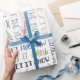 Modernes und minimalistisch niedliches, schlichtes Weihnachtsgeschenk Sprichwort Verpackungspapier. Einfaches Design in Rosa, Weiß und Gold. In dieser Saison, heilig fröhlich, ist es die schönste Zeit des Jahres, gelassen Schnee, haben Sie sich ein fröhliches kleines Weihnachtsfest, spazieren in einem Winterwunderland. Weihnachtsbaum und helle Designs.