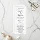 Modernes Schwarz-Weiß-Hochzeitsprogramm mit einem einfachen und minimalistischen Layout mit Ihren Namen in einem eleganten Kalligrafieschrift zusammen mit Ihren Hochzeitsdetails und der Reihenfolge der Zeremonie unten. Der Rücken hat Ihre Hochzeitsfeier und danke Ihnen Nachricht. Ein modernes Design, das mit jedem Hochzeitsstil passt.