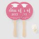 Minimalistische Abschluss-Handfans mit einem schlichten und klassischen Design mit einem Graduierkopf und einer "Jahrgangsklasse" in einer dicken Schrift, zusammen mit dem Namen des Absolventen in Weiß auf einem rosa Hintergrund. Die Hintergrundfarbe kann in eine beliebige Farbe geändert werden. Traditioneller Stil mit modernem Flair für einen Absolventen.