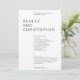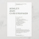 Einfaches minimalistisches Hochzeitsfeierprogramm, das von Fremdverzierung und Priorisierung von Funktionalität, Ausgewogenheit und Harmonie beraubt wird. Das Design hebt die Namen des Paares als Brennpunkt in einem großen abgeschiedenen Textblock hervor und verschiebt den Abstand für die übrigen Details. Saubere minimalistische Typografie. Auf der Kartenrückseite befinden sich das Brautparty und die einfachen Memorydetails in weißem Text auf farbigem Hintergrund. Erhältlich in einer kuratierten Auswahl an modernen, reichen Farben. Design ist leicht anpassbar und personalisiert. Bitte wenden Sie sich an uns, um Ihre Wünsche zu erfüllen. Immer gerne helfen! Hinweis: Alle Textbereiche werden leer Verlassen, um das Entwurfstool für spezifischere, aufwändigere Anpassungen zu entfernen oder zu verwenden.