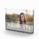 Der moderne Abschluss-Foto-Block zeichnet sich durch Ihr landschaftsorientiertes Foto aus, mit einem schieren weißen Overlay mit "Graduate" in fett weißer Schrift, sowie Ihren Namen, Ihre Schule und Ihr Abschluss Jahr.