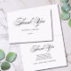 Diese schlichte, elegante Schwarz-Weiß-Hochzeitskarte bietet ein minimalistisches Layout, das lustige, skurrile Schrift-Typografie und klassische Serif-Schriftart in Schwarz auf schlichtem, weißem Hintergrund kombiniert und ein modernes, zeitloses Design mit Vintagem Flair ermöglicht. Der Dankeschön-Text auf der Vorderseite und im Inneren der Karte ist in einem romantischen handgeschriebenen Kalligraphie-Schriftart mit skurrilen Schnörkeln mit den unten angegebenen anpassbaren Details geschrieben. Die Rückseite der Karte ist minimal weiß. Sie können den Text in der Produktvorlage bearbeiten, um ihn für Ihre eigene Hochzeit zu personalisieren.