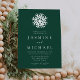 Feiern Sie Ihren besonderen Tag mit unserer Einfach Schneeflocken Wald grüne Hochzeitseinladung. Dieses elegante Design mit einer fett weißen Schneeflocke vor einem waldgrünen Hintergrund ermöglicht es Paaren, sich mit ihren Namen und Hochzeitsdetails in weißen Serifenschrift und Kalligraphie-Akzenten zu personalisieren. Ideal für moderne Winter-, Ferien- und Weihnachtsfeiern, ist diese Einladung ein Set für ein festliches und unvergessliches Fest.