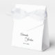 Diese einfache, schwarz-weiße Kalligrafie-Zelt-Gefälligkeitsbox verleiht einem eleganten Luxus, aber zugleich modernes Gefühl für eine minimalistische und traditionellere oder formale Hochzeit oder Veranstaltung. Die lässige Kalligraphie ermöglicht ein antikes Ambiente, während das klassische neutrale Design mit jedem einzigartigen Aspekt Ihres Festes kombiniert werden kann.