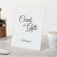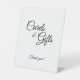Dieses einfache, schwarz-weiße Kalligraphie-Karten und Geschenke Podestal Schild bringt einen eleganten Luxus, aber moderne Atmosphäre zu einem minimalistischen und traditionelleren oder formellen Hochzeitsempfang. Die lässige Kalligraphie ermöglicht ein antikes Ambiente, während das klassische neutrale Design mit jedem einzigartigen Aspekt Ihrer Ehefeier kombiniert werden kann.