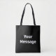 Sie können Ihre eigene Nachricht in weißem Text auf dieser schwarzen Tasche erstellen.