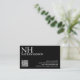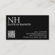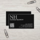 Moderne QR Code Visitenkarten mit einem einfachen und minimalen schwarzen Design mit Ihrem Monogramm in einem fett formatierten Schriftart und Ihrem Namen in der oberen links Ecke. Ihre Kontaktdaten befinden sich in der unteren rechten Ecke.