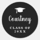 Moderner Abschluss Aufkleber mit einer Graduiertenkappe über dem Namen des Absolventen in einer eleganten, dicken Schrift zusammen mit dem Unterrichtsjahr in Weiß auf einem schwarzen Hintergrund. Diese einfachen und minimalen Aufkleber sind perfekt für einen Absolventen eines Mädchens und eignen sich hervorragend als Umschlag Aufkleber oder für Gastgeschenke.