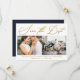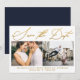 Schöne Save the Date mit eleganten Imitaten goldkalligraphie Skript und zwei Fotos auf der Vorderseite, mit einem dunkelblauen Rücken.