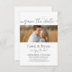 Einfache Skripte Save the Date Monogram Einladung. Dieses einladende Foto vereint elegante und minimalistische Designelemente mit einem Foto, um Ihren besonderen Tag zu begehen. Monogramm auf der Rückseite und minimales Schwarz-Weiß-Design für Ihre Hochzeit, Jubiläum oder besondere Anlass.