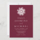 Feiern Sie Ihren besonderen Tag mit unserer Einfach Schneeflocken Wine Wedding Einladung. Dieses elegante Design mit einer fett weißen Schneeflocke vor einem weinfarbenen Hintergrund ermöglicht es Paaren, sich mit ihren Namen und Hochzeitsdetails in weißen Serifenschrift und Kalligraphie-Akzenten zu personalisieren. Ideal für moderne Winter-, Ferien- und Weihnachtsfeiern, ist diese Einladung ein Set für ein festliches und unvergessliches Fest.
