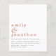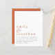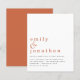 Einfache Text Terracotta Hochzeitseinladung.Ein günstiger Preis SMALLER 4.5" x 5.6" Alternative. Erhältlich in einem SEMI-GLOSS 110 lb CARD STOCK, der die Standardoption (dicker für Einladungen) ist, ODER einem SATIN FINISH 80 lb THINNER PAPER STOCK (ideal für Gehäuse). Umschläge sind optional und etwas größer als die Kartengröße. Einfach und. Informell sind Ihre Vornamen groß in stilvollen Kleinbuchstaben mit den Details unten. Personalisieren Sie den Text einfach.