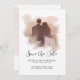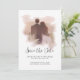 "Simple Watercolor Modern Script Palm Foliage Foto Save the Date." Dieses elegante und schlichte Foto bietet Save the Date Ihre Verlobung-Fotografie unter einem sanften rosa Aquarell-Waschbecken, mit Palmblättern und Pampas-Gras-Overlay, der einen romantischen gefilterten Effekt verleiht. Das Bild von Keepake eignet sich zum Rahmen, während auf der Rückseite die Aquarellfarbenwäsche mit weiteren Informationen für Ihre Gäste vergrößert wird. Kunst von international lizenzierter Künstlerin und Designerin, Audrey Jeanne Roberts, Copyright.