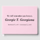 Dieses grundlegende Begräbnis/Gedenkgutachten-Gästebuch enthält die Meldung "Wir werden uns für immer erinnern", sowie den personalisierten Namen und das Geburts-/Sterbedatum des verstorbenen Individuums. Es könnte genutzt werden, um wohlwollende Wünsche für die Verwandten und Freunde von jemandem zu erfassen, der vor kurzem verstorben ist. Der Text ist schwarz, die Hintergrundfarbe hellrosa.