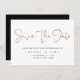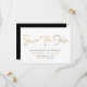 Moderne minimalistische Cooper Gold Drehbuch Save the Date Karte. Diese elegante Karte verfügt über handgeschriebene Schrift in Cooper-goldfarben auf weißem Hintergrund, Details zur Hochzeit und Namen in Hauptstadt Schrift in Schwarz. Die Rückseite der Karte ist schwarz. Um diese Vorlage zu bearbeiten, klicken Sie auf Weitere Anpassung.
