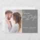 Elegantes und modernes Design mit einem Typografie-Skript Save the Date und Ihrem Lieblings-Foto vor einem gedämpften grauen Hintergrund. Ideal, um Ihre kommende Hochzeit in einer modischen, minimalistischen Art und Weise zu verkünden. Einfache Anpassung wichtiger Details und Ihr bestes Foto der Wahl.