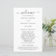 Einfaches Hochzeitsprogramm mit einem sauberen und minimalistischen Design mit einer eleganten Touch mit dem Wort "willkommen" in Skripten mit Swashes. Ein modernes Schwarz-Weiß-Design, das sich wunderbar mit jedem Hochzeitsstil abstimmt. Diese billigen Hochzeitsprogramme werden auf Papierbögen gedruckt, um eine preisgünstige Option zu erhalten.
