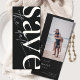 Diese 4" x 8" speichern die Datumskarten mit einem minimalistischen Design in eggshell-Weiß- und Graubuchstaben auf schwarzem Hintergrund mit Platzhaltern auf der Rückseite für die verlobten Paarnamen, das Hochzeitdatum und die Veranstaltungsinformationen und Ihr Lieblingsstichtum!