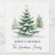 Niedliches Weihnachtsweinetikett für Weihnachtsgeschenke mit einfachem Skriptfamiliennamen und einem Aquarellwein Weihnachtsbaum mit Schnee.