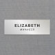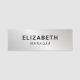 Einfache moderne Namensmarke mit Namen und Titel vor silberfarbenem Imitat-Hintergrund.