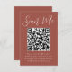 Mit diesen modernen Hochzeitskarten mit QR-Code können Sie Ihre Hochzeit oder Veranstaltung ganz einfach UAWG machen. Die eleganten Hochzeitsgehäuse-Karten zeigen "Scan Me" in einem skurrilen weißen Skript mit Rosthintergrund. Personalisieren Sie die Karte mit Ihrem UAWG, Ihrer Hochzeitswebsite und den Instruktionen für Gäste, die die Vorlagen verwenden. Auf der Kartenrückseite ist Platz für zusätzlichen Text und/oder Foto vorhanden. Entworfen, um mit unserer Simple Script Hochzeitskollektion zu koordinieren.