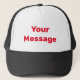 Auf diesem schwarz-weißen LKW-Hut kannst du deine eigene Nachricht in hellrotem Text erstellen.