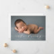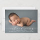 Moderne Geburtsankündigung mit vollblütigem Foto auf der Vorderseite und eleganter Kalligraphie.