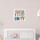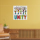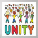 Unity Design ist eine Menschenmenge verschiedener Strichmännchen, die über dem großen UNITY-Schriftsatz stehend sind. Farbenfrohe und warme Grafik, um den Power und die Freude an Unity zu zeigen.