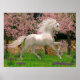 Ein legendärer Hengst mit einsamen Einhornbäumen geht durch einen Wald voller Blume und Kirschbäume.