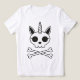 Dieses grafische Kunstwerk verbindet das whimsical und das makabre, mit einem stilisierten Schädel mit großen, ausdrucksstarken Augen, einem Einhorn und katzenartigen Ohren. Wie man an Sophie's T - Shirt sieht, wird der Schädel von Kreuzknochen begleitet, was seine spielerische, aber gotische Anziehungskraft verstärkt. Das Design verwendet ein einfaches Schwarz-Weiß-Farbschema, das den Fettdruck und die grafische Beschaffenheit der Illustration betont. Diese einzigartige Mischung macht es zu einer perfekten Wahl für alle, die eine Mischung aus Fantasie, dunklem Spaß und minimalistischer Kunst schätzen.