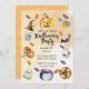 Diese Halloween-Einladung zeigt ein Layout im Wasserfarben-Stil mit verschiedenen thematischen Illustrationen, darunter einem ausgehöhlten Kürbis oben, Süßigkeiten, Fledermäuse, eine Flasche mit Trank, Totenköpfe, ein Gespenst, einen Kessel und andere klassische Halloween-Symbole, die um den Textbereich herum angeordnet sind. Der mittlere Abschnitt enthält anpassbare Details zur Veranstaltung wie Datum, Uhrzeit, Ort und RSVP-Informationen, die alle vor einem hellen, texturierten Hintergrund stehen, der das Kunstwerk hervorhebt.