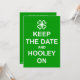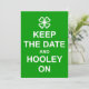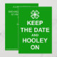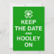 'Behalt Calm und..' Stileinladung mit irischem Design eines Kleeblatts und die Worte "Behalt the Date and Hooley On" in Weiß auf grünem Hintergrund. Geboren von Jess Perry. (Ein "Hooley" ist eine irische Umgangssprache für ein fröhliches, boisterisches Party!)