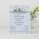 Unser kleiner Zug versorgt ausgestopfte Tiere einer Giraffe und Elefanten auf einer Bahnstrecke. Der Hintergrund ist in Blautönen gehalten, mit einem Raum für die Duscheinladung auf Vorder- und Rückseite.