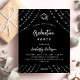 Ein schwarzer Hintergrund mit Imitaten silbernen Sternen und einer Kappe. Personalisieren und fügen Sie einen Namen und Party-Details hinzu. Der Abschluss und der Name sind mit einem modernen, handgeschriebenen Stil geschrieben. 1 Blatt = 1 Einladung mit Druckkante bis Kante.