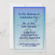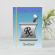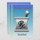 Diese himmelblaue und goldene Einladung ist mit einem Mörtel und Pestle dekoriert.