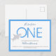 Ein "Er ist ein erbitterter ONE" erster Geburtstag, grauer Hai, Postkarteneinladung. Diese Postkarte zeigt einen Cartoon Hai mit dem Wort ONE in großen Buchstaben. Die Farben sind blau, weiß und grau. Einfach die Wörter anpassen, diese Postkarte in Ihren Warenkorb einladen und diesen fantastischen Geburtstag feiern. Fierce One Shark Animal Einladung zum Geburtstag Postcard Holidayday Design | ©Melissa Patton Artist/Illustrator