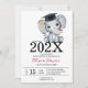 Ein kleiner, grauer Elefant mit einem Diplom und einem Graduierungssockel auf dem Kopf
