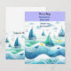 Ein niedliches nautisches Design mit blauen und smaragdgrünen Segelbooten auf einem welligen Ozean mit ein paar kleinen gelben Enten im Wasser. Passen Sie Ihre Babydusche nach Wunsch an.