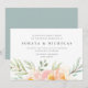 Unsere schicke, blumengeschmückte Hochzeitseinladung in horizontaler Form umrahmt Ihre Hochzeitsdetails mit einem unteren Rand von lackierten Aquarellfarben und Blattwerk in sanften Pfirsichfarben und Pastellgrün. Koordiniert mit unserer Hochzeit- und Veranstaltungskollektion von Airy.