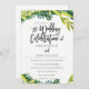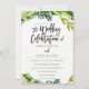 Boho Rustic Floral Wedding Einladung entworfen von Birch + Blossom.Schöne Aquarell-Blätter umgeben die Vorderseite der Einladung und schaffen einen rustikalen Stil. Der Text ist eine schöne Balance von Drehbuch und modern. Auf der Rückseite der Einladung befindet sich ein schöner Halbkreis der gleichen Blätter mit den Initialen der Braut und des Bräutigams.
