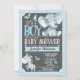 Elefante und zebraartige Dschungeltiere, blaue und graue Babydusche Einladung. Die Farbgebung ist blau und grau.