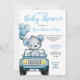 Babydusche mit Baby Bear (Teddy Bear) in blauem Auto und Ballons für NEW NORMAL Babydusche in pandemischer Covid. https://www.zazzle.com/collections/bear_blue_wooden_rustic-119286325608459140?rf=238722231659402553 Mehr Infos zum Thema: gmail.com