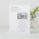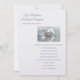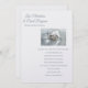 Diese Hochzeitseinladung wird in einem klassischen Layout auf weißem Perlschimmer-Hintergrund mit modernem Layout gezeigt. Foto von zwei Hochzeitsringen auf einem weißen Satinkissen. Text in einer dunkelblauen Farbe. Passen Sie dieses Element an, indem Sie den Beispieltext nehmen und stattdessen Ihre Informationen darin einfügen. Bild auf Lager.